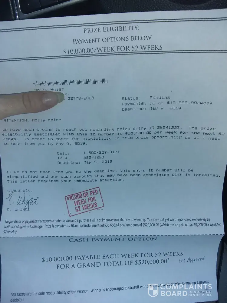 I received a letter in the mail telling me that they have been trying to reach me regarding a prize entry with an idea to 894-1223. With this being nothing that I signed up for and never heard of and the fact that is $10, 000 per week for 52 weeks kind of piqued my interest that it maybe a scam. I didn't even bother reading the rest of it whatever I'm going to put another claim here that currently April 23rd of 2019 I received this letter telling me that I'm going to be rich. I don't trust it and neither should anyone else.