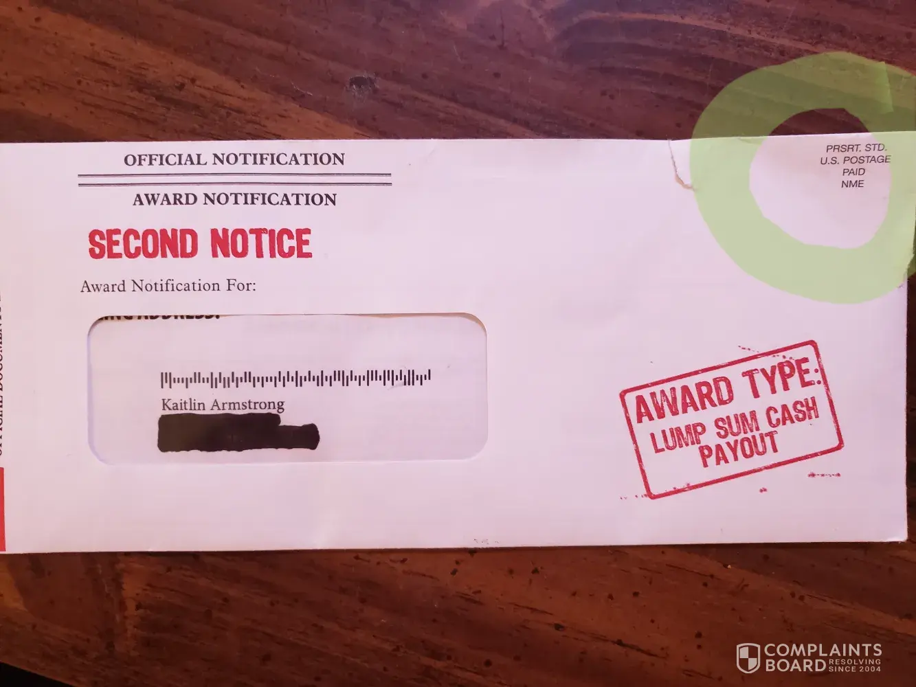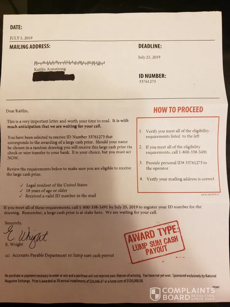 Quiero saber que tan cierto es esto. Me enviaron esta carta: NÚMERO DE ID: [protected] Querido CÓMO PROCEDER Esta es una carta muy importante y vale la pena leer. . Con mucha anticipación estamos esperando su llamada. Verifique que cumpla con todos los requisitos de elegibilidad listados a la izquierda. Ha sido seleccionado para recibir el número de identificación [protected] que corresponde a la adjudicación de un premio en efectivo grande. Si se elige su nombre en un sorteo al azar, recibirá este gran premio en efectivo mediante cheque o transferencia bancaria a su banco. Es su elección, pero debe actuar AHORA 2. Si cumple con todos los requisitos de elegibilidad, llame al [protected] 3. Proporcione un número de identificación personal # [protected] para revisar los requisitos a continuación para asegurarse de que es elegible para recibir al operador El gran premio en efectivo. 4. Verifique que su dirección de correo sea correcta Residente legal de los Estados Unidos V18 años de edad o mayor Recibió un número de identificación válido por correo 21805-48X / P2 / 1113 Si cumple con todos estos requisitos, sorteo. Recuerde que aquí están en juego los pagos en efectivo grandes, llame al [protected] antes del 18 de abril de 2019 para registrar su número de identificación para el banco. Esperamos su llamada. Sinceramente. TIPO DE ADJUDICACIÓN PAGO EN EFECTIVO DE SUMA LUMP E. Wright cc: Cuentas por pagar Departamento re: pago de pago en efectivo de suma global No es necesario comprar ni pagar para ingresar o ganar, y una compra no mejorará sus posibilidades de ganar. No tienes intercambio de revistas. El premio se otorga en 30 cuotas anuales de $ 36, 66667 o una suma global de $ 520, 000.00. sin embargo, ganó. Patrocinado exclusivamente por la norma nacional EN348.