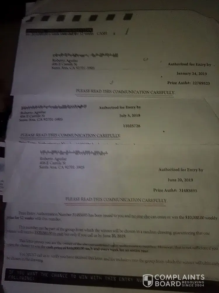 My name is Roberto Aguilar customer ID: [protected] I am submitting a complain regarding me being a three consecutive communicating prize winner for $10, 000.00 a week for 52 weeks which is $10, 000.00×52weeks=$520, 000×3=$1, 560, 000.00 these are my authorization entry dated July 5, 2018 #[protected] authorization entry dated January 24, 2019 #[protected] and athorization entry dated June 20, 2019 #[protected] to this point the communication has been non stop everyday all day have in mind that I am not an informant and knowing that my weakness is not being able to control my thoughts and I'm not that great at lieing so not only is everything and everyone not just using me with huge profitable income but all it did was completely ruin my social life but I have no privacy up to a point that Im becoming a loner but nothing to commit suicide so since we both know that it's real and it's not a scam I want to know WHEN AM I GONNA GET PAID FOR IT!knowing that everyone seems to be dealing with me based on lies and being ignorant about it, making it seem it's the opposite and knowing me laking knowledge on certain categories and dealing with political lies, identity theft, hackers, theifs(contributers) and illuminaty weird stuff that's a little bit exaggerated from my point of view, its seems to me that it's a complete scam, so do you guys suggest I get legal help?