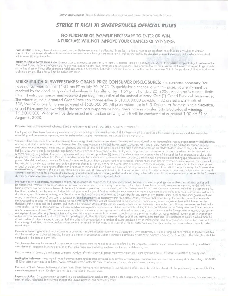 this has been going on about for five months now. My significant other is a subscriber to the periodicals magazine company and this sweepstakes started showing up when he joined the periodicals company for a batch of magazines. "Strike It Rich VI Sweepstakes" is the name of the contest and we really don't know if this is a real deal or a scam. gets an envelope about every three to four weeks stating on the front in RED letters SECOND NOTICE. on the back of the envelope and the side of the letter inside is this: