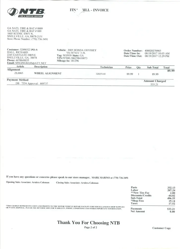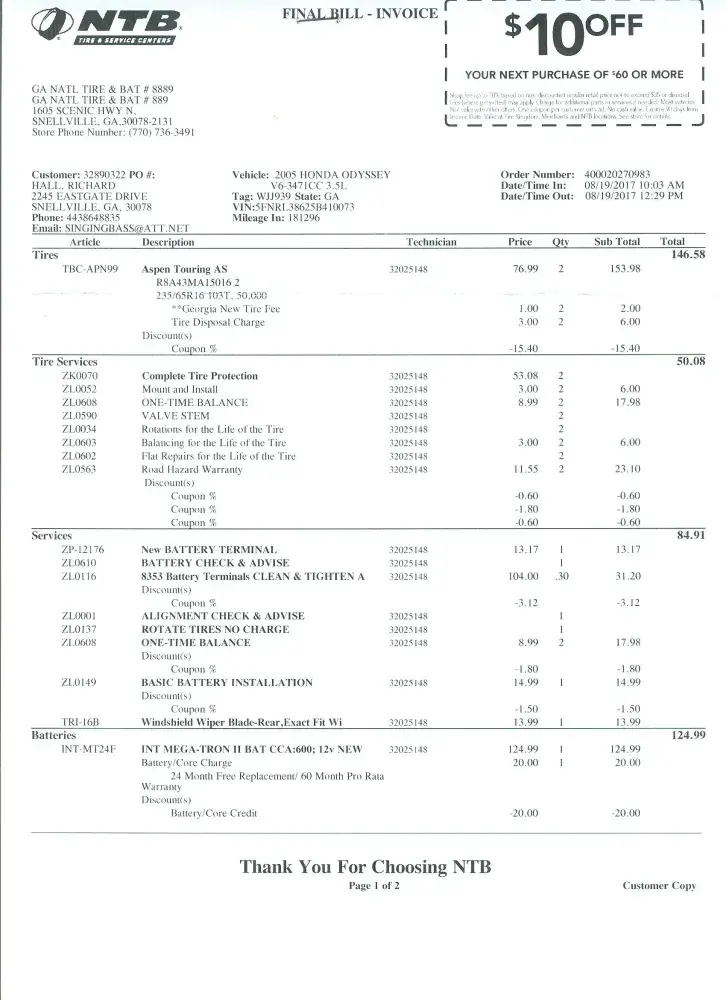 National Tire & Battery [NTB] service I receive at your atlanta northeast expressway location