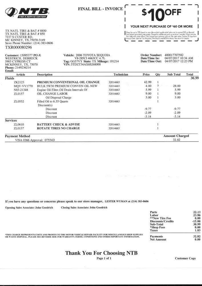 Hello i took my blazer to them for an alignment i had just replaced all of the ball joints and upper control arms they quoted me $89 but charged me $190 when i went back to pick up the suv the battery was dead and had been removed from the suv they told me i need a new battery and i let them know it was a new battery and it would be replaced free of charge were i bought it, i drove to suv home and found the steering wheel was now in a left turn position while going forward and it pulled hard to the right, i hade the battery checked and the alternator they were both good and working just fine, i drove about 50 miles and got a service engine light code was p0410 i replaced all the parts and found that a air check valve was no good and had recently been removed and replaced with a bad one, well that explains why the battery was removed, you have to take it out to put a faulty part in its place and it had fresh sealer on the exhaust manifold and loose nuts holding it on, and oh yah they also tried to tell me a brand new ball joint was bad and i had just removed the front shocks and checked them when i installed the new ball joints, but i found that they put a pry bar to them and had bent them so they were now no good and i needed to replace them with a new set, so my total cost was $190 for a bad alignment $60 for a new set of front shocks and $275 for a new secondary air pump and 2 new check valves and $70 for a new solenoid for secondary air system and new vacum lines and then another $90 for an alignment at a quality alignment shop my total cost for an alignment at NTB was $610 WOW what a deal that was parts only, i do my own work to save on labor, this was september of 2016 that truck has been parked in my garage since then as i am not a rich man and it would not pass air team thanks to them, now the plates are expired and i can not drive it anyway, but it is fixed now and costs me another $53 a month for insurance and can not be driven to air team to be tested again WTF ! they suck they should just sell tires maybe they can get that right ( crooks ) do not go there for anything, stay away from them, or pay and pay for work you do not need before you go there.