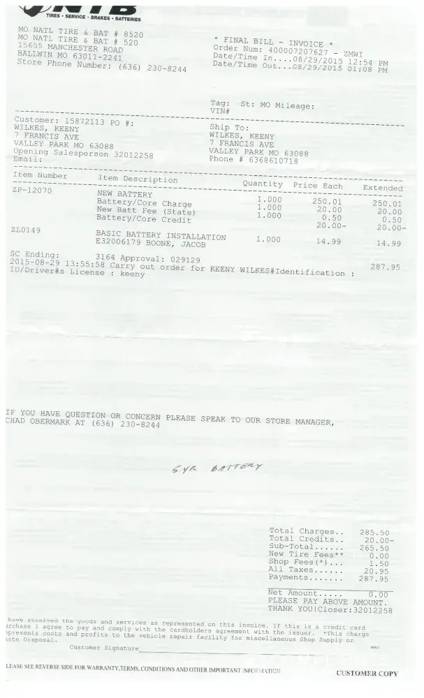 So, I left, and went home and submitted the receipt given to me by Chad to my insurance company. I was informed by my insurance company that the noted info on the receipt that I received from Chad was useless, because no info was given other than showing the item description as a new battery, and charges.