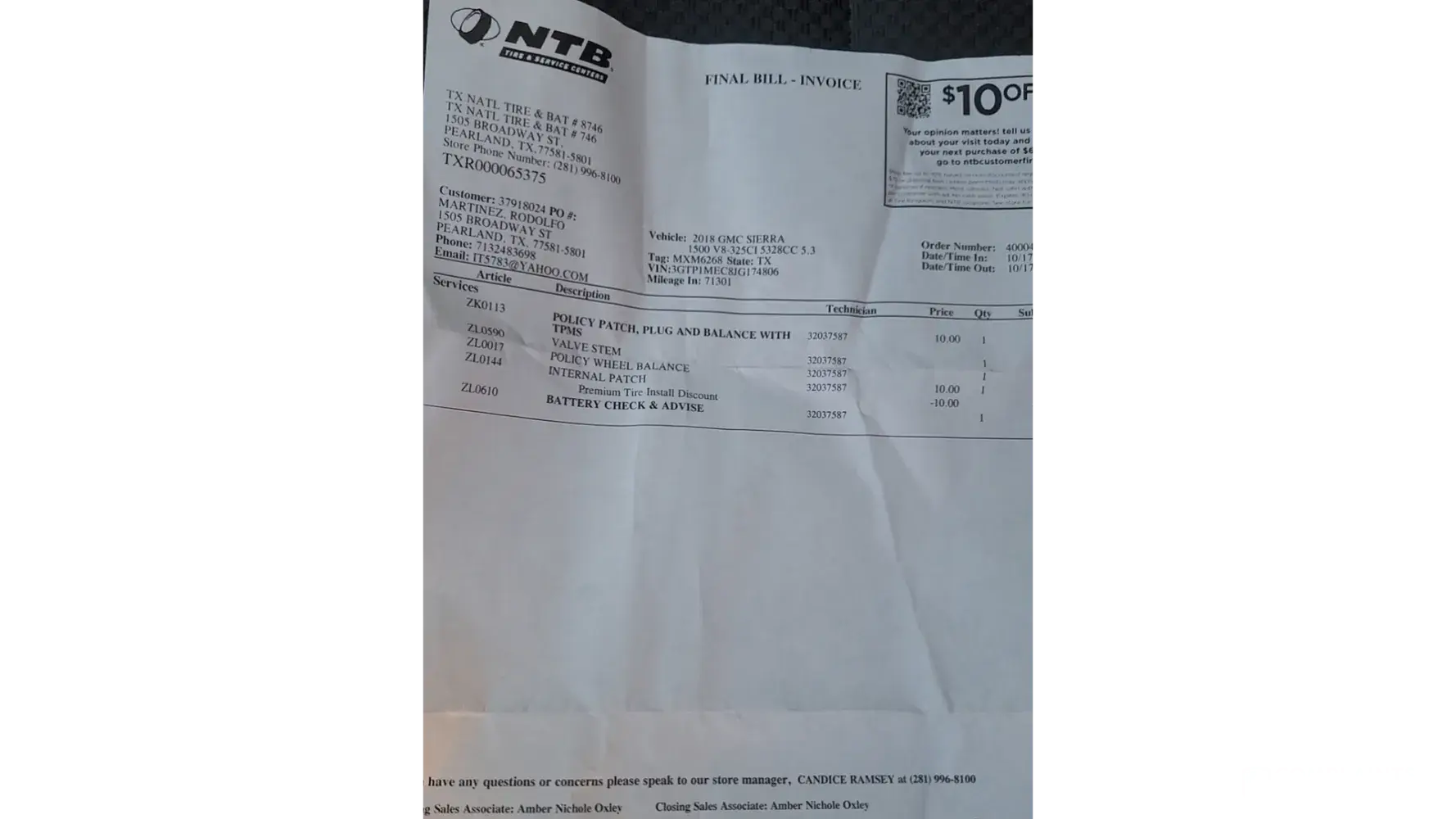 After your store national tire & battery at 17313 north freeway (fm 1960 & i-45} in houston, texas took eleven days to repair the front end on my 1989 dodge xplorer 230 xlw camper van I just want you to know how much I appreciate the deep heavy black greasy boot marks left on the driver’s side light blue floor carpet [from the front-end mechanic with a constant attitude] when I picked up my vehicle today 10/25/22. Back in 1987 I worked for national tire wholesale in houston (now ntb) operating the only 18 wheeler in texas the company had at the time…back then the company was very professional and a quite satisfying place to have your vehicle worked on, and, to work ‘for’. Not so much anymore. It’s really sad to see what i’ve witnessed in my dealings regarding this repair visit….Including torn up waiting room furniture (literally pieces hanging torn on the furniture) and filthy coffee area. I will never again step foot into another ntb store as long as I live…even if your company ‘was’ the last repair facility left on the planet. Oh, I almost forgot! Last year I came to this very same store to buy two new tires for the front of my truck. Instead of mounting them on the front axle as I wanted they were mounted on the rear instead. Once I told the ‘lady’ sales person [that I bought the tires from] immediately rudely stated her tire mounters are professionals and don’t make this kind of mistake…’before’ even looking at my truck. Ntb, I highly suggest that you take a trip to a discount tire company store and see how “they” treat “their” customers and their customer’s vehicles…ntb should make an effort to be just like them because discount tire employees go above and beyond the call of duty to treat their customers more professionally and with more respect than ‘your’ company would ever even think of doing. I spent $3562 up front, in full, four days before your store even started working on my vehicle …and ‘this’ is how i’m treated. Smh.