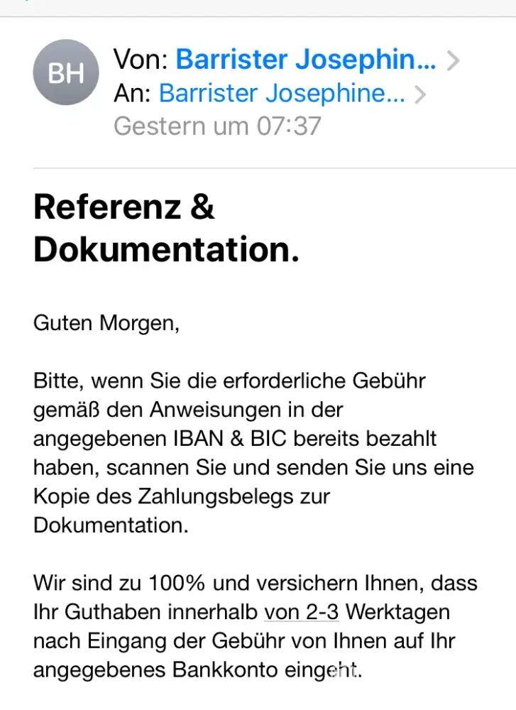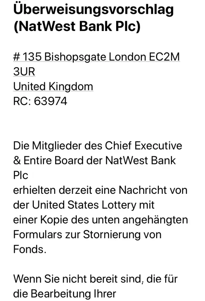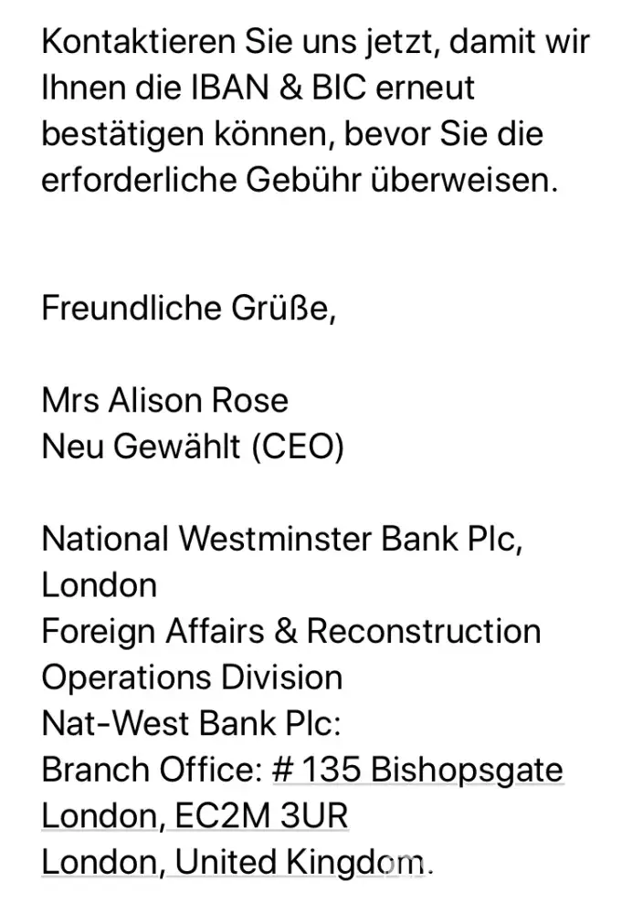 Ich würde gerne wissen, ob diese Nachrichten von Ihrem Institut kommen und ob die Nat -West Bank das Anwaltsbüro tatsächlich damit beauftragt hat, mich zu kontaktieren .
