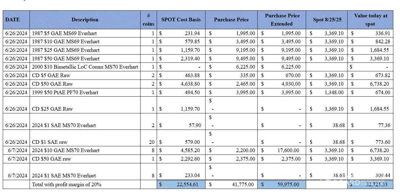 In June 2024, I paid a total of $59,975 (a $40,000 check plus $17,500 and $2,475 debit transfers), documented on invoices #NCBR00032818 and #NCBR00033182 — amounts I was later told were worth only $22,554.61 (and which market quotes show are approximately $32,725.33 today). The receipts are all attached.
