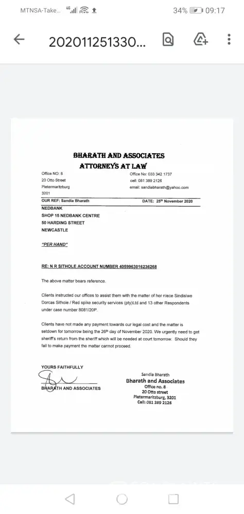 I also would like to advise that I did advise Nedbank that I was going to pay at the end of the month to fix account before my account was moved to legal department.