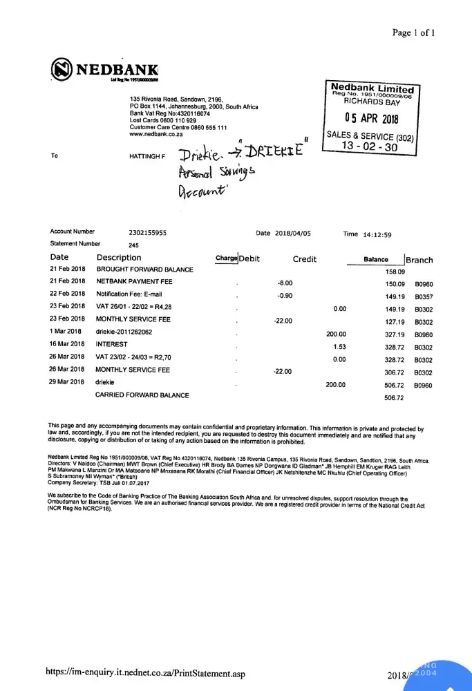 So up to so far my problem is still hanging because it looks like the Nedbank personnel cant face it but not telling that they cant face it.