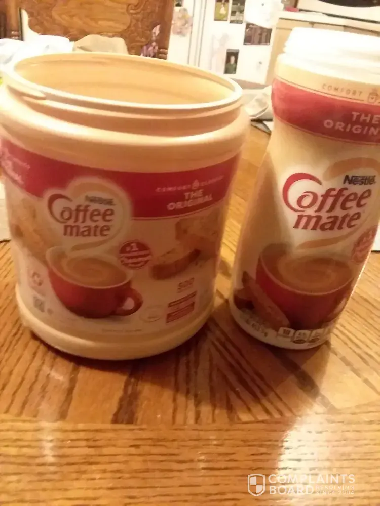I purchased the same as always and this batch of the 35.3 oz has a tint of light brown color unlike the white color i usually get. This batch looks almost like cornmeal. It has a strange smell, does not tase good at all and leaves a film on top of the coffe. Its bad! I have pictures. I will take it back to Walmart however I'm irritated that I have to do that. I did purchase a smaller bottle at a dollar store close by so I can have my coffee in the morning. I hope Nestle can assure me that what i drank was not something that could harm me or anyone else.