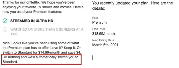 "Nice! Looks like you've been using some of what the Premium plan has to offer. Love it? Keep it. Or switch to Standard for $14.99/month and save $4. Do nothing and we'll automatically switch you to Standard."