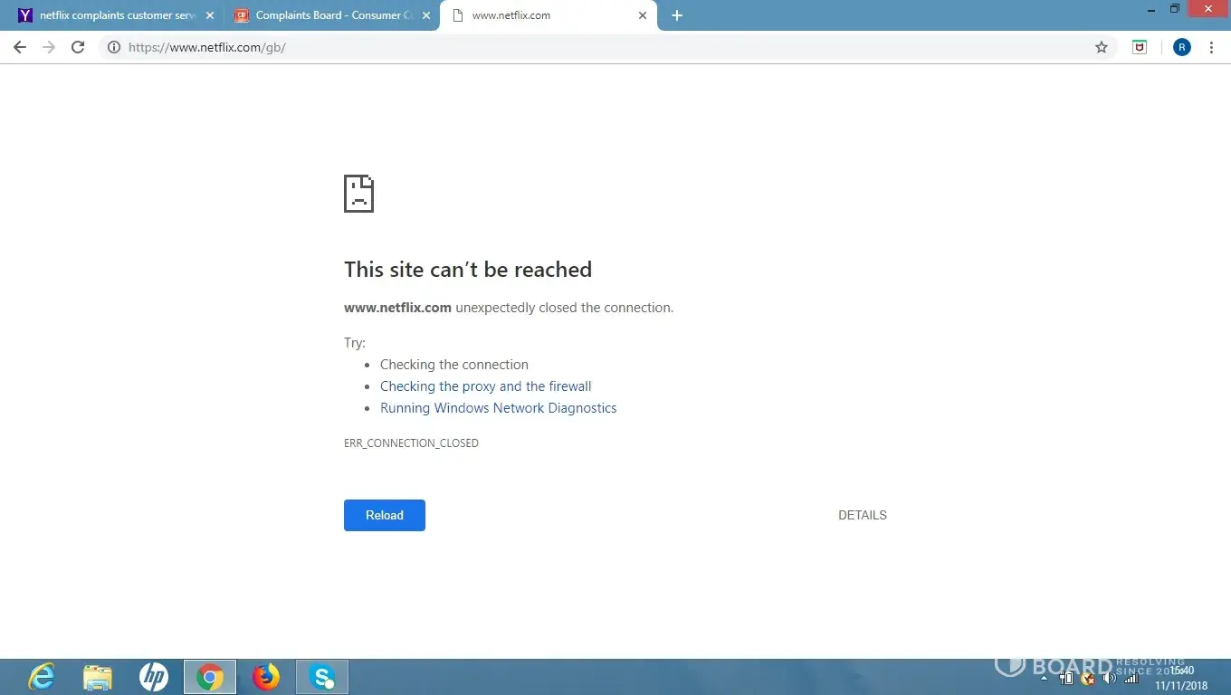Since yesterday evening 10/11/18 and all of today 11/11/18 the netflix site has not been working, I can reach any other site (my intrenet connection and settings are fine) but when i try to go on netflix page it says 'This site can't be reached www.netflix.com unexpectedly closed the connection.' This is very annoying, as we pay for our subscription, you should provide a better service, this is not the first time it has happened unexpectedly, either you should let customers know the service will be down or provide a refund...Thanks