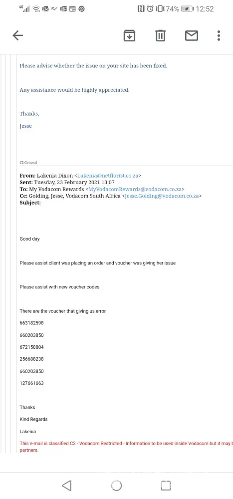 I won vouchers from Vodacom in January through their Vodacom/Netflorist campaign, but due to issues on the netflorist side I was unable to use these voucher codes and was told by their agent that I would still be able to use them after they expire, I have been following up with their agent and the last I was told was Netflorist had instructed vodacom to disable - Vodacom agent said "Netflorist had instructed us to disable the campaign until further notice for V-Day,