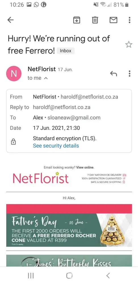 I opted out from receiving emails from the NetFlorist website on 2 occasions and replied to emails from the company requesting to be unsubscribed, most recently in the middle of May. Since this time I have received more than 8 emails from them (only 8 saved in my inbox at the moment). I would like to be removed from their mailing list and for them to be fined for their breach. Email address [protected]@netflorist.co.za
