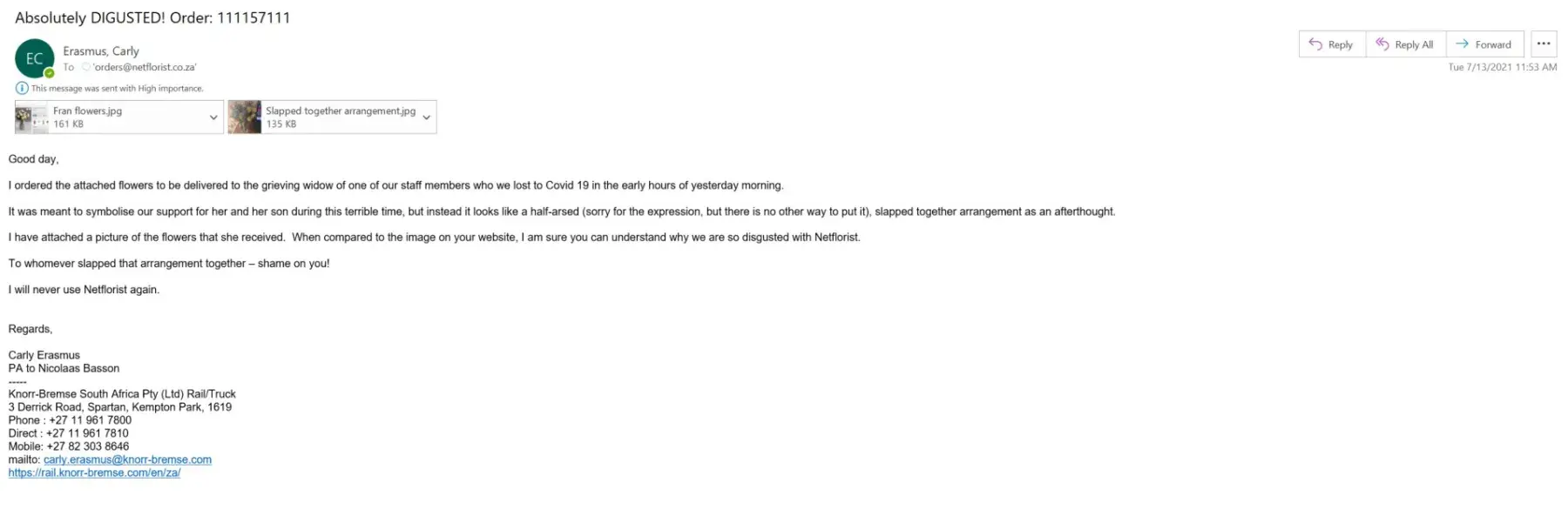 Considering the exorbitant prices that customers pay for the products and service which we expect to be prompt and as stipulated on the order, it is disappointing that NetFlorist does not keep to its promise and arrangement as paid for by the customer.