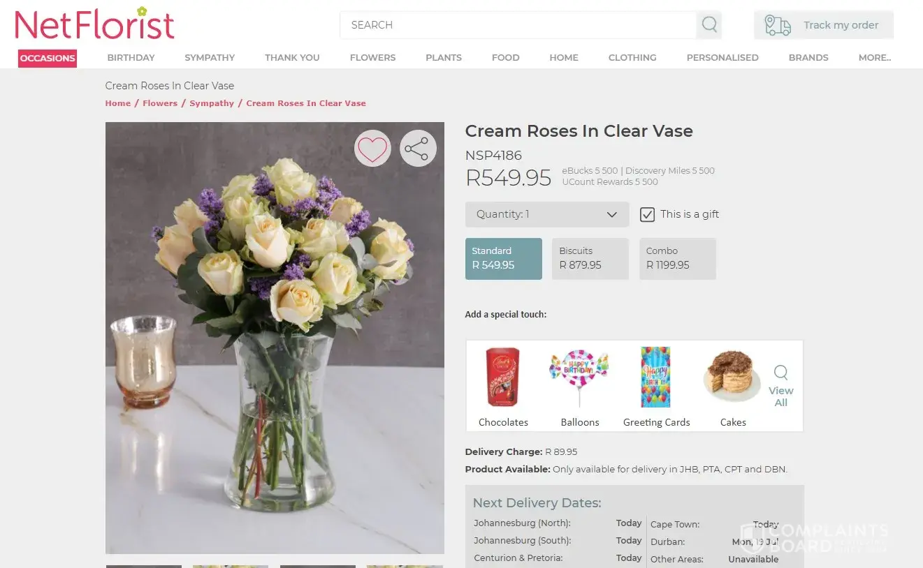 Do not use Net Florist . I ordered 10 tulips at a cost of R949.90 for my 83 ur old mother who lives alone .she was so excited to receive her flowers . I tried to track the delivery with the given code but it did not exist . Payment was confirmed from the bank . I phoned Net Florist who informed me that day that they did not have tulips in stock . My mother stayed at home especially for the delivery but eventually went out in the late afternoon . When she arrived a bunch of old flowers was left on the road for her with no Mother's Day note . I am disgusted with Net Florist ! They are scammers . Beware !