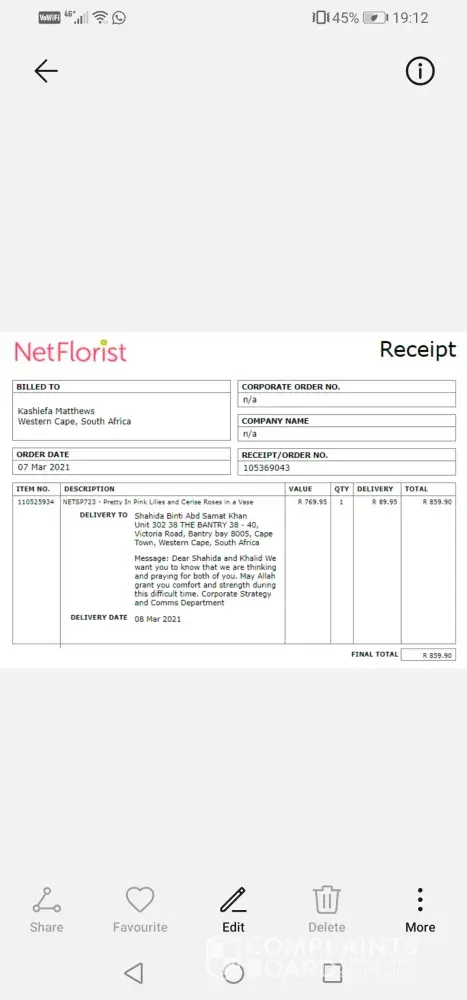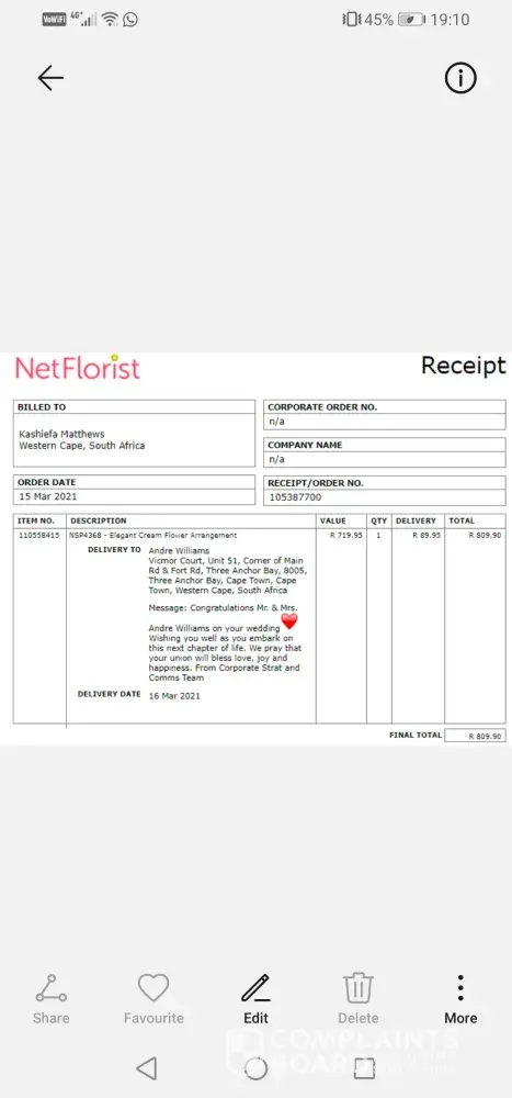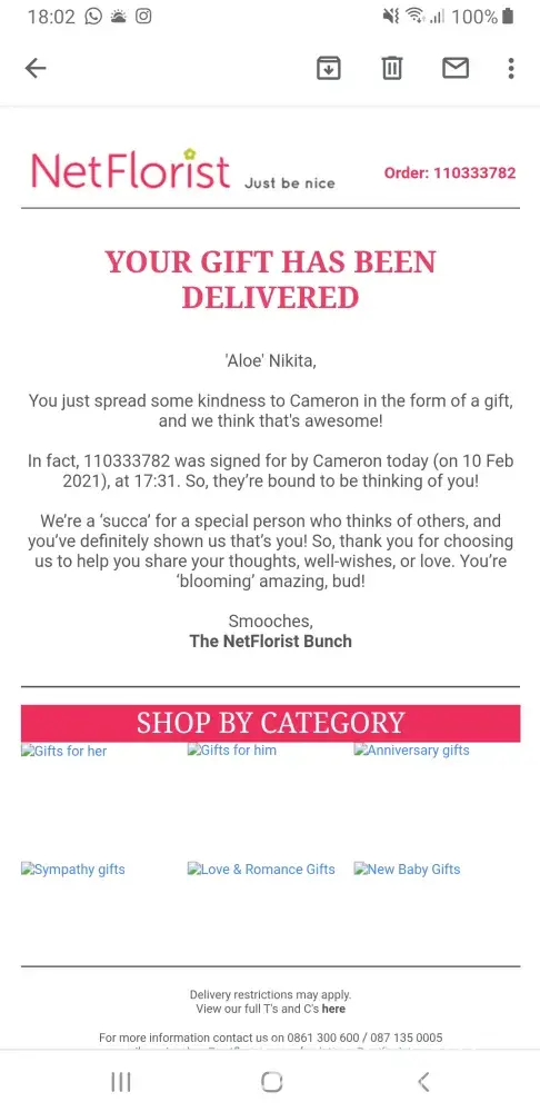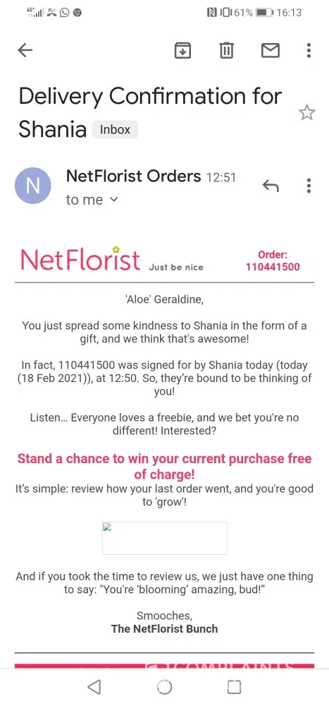 She then received an official message from Net florist on the 30th May 2021 stating that this gift had been delivered and was signed for by my wife - Again this was not the case!