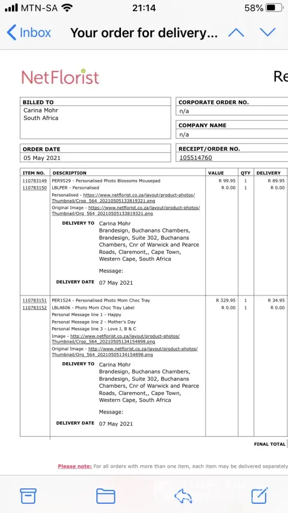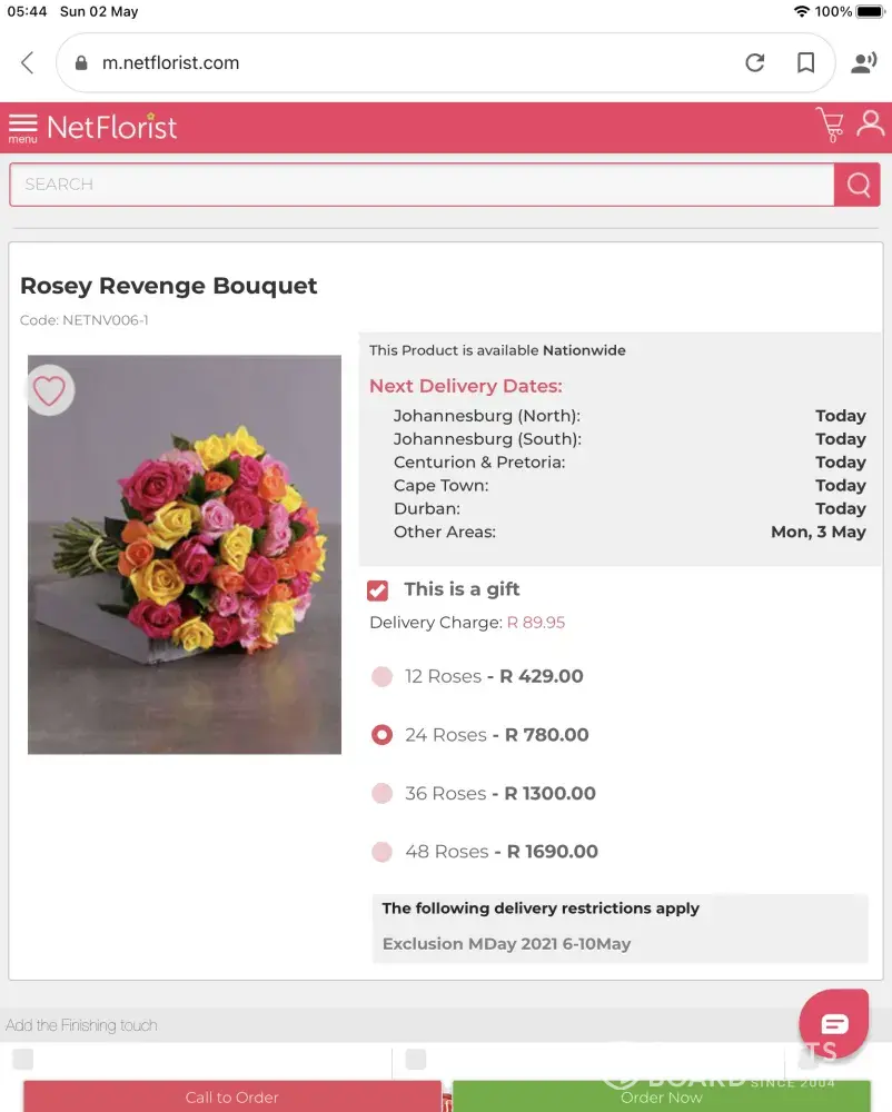 I placed an order for a 24-rosey bouquet to be delivered to my mother for her birthday. I paid R780 for the bouquet + delivery charges. This bouquet and one other item was to be delivered on 30 April.