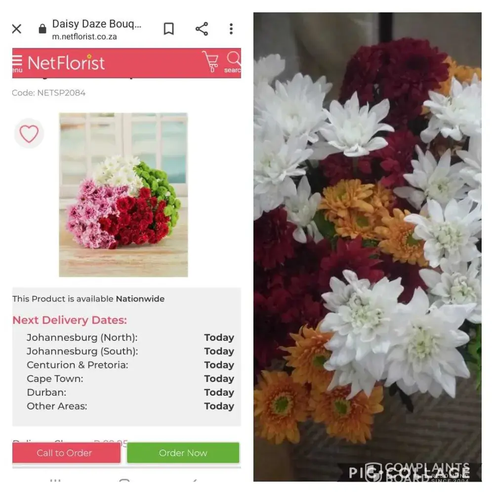 Dont order from netflorist: you guys are a joke! I am furious! We spent r600 on a large arrangement of flowers for my grans birthday... We went for netflorist as we wanted something with the wow factor and we got what was less than what you would get from the local spar. I expect a full refund, if I knew that was what you would deliver I would have just gone and bought store bought flowers. What has happened to you guys? I expect a full refund so that we can take the money and make-up for this embarrassing gift! This is taking advantage of your customers, I want a full refund or I am taking this further!😡🤬 on top of all of this, yous delivered at 17:15... Like her birthday is almost over?!