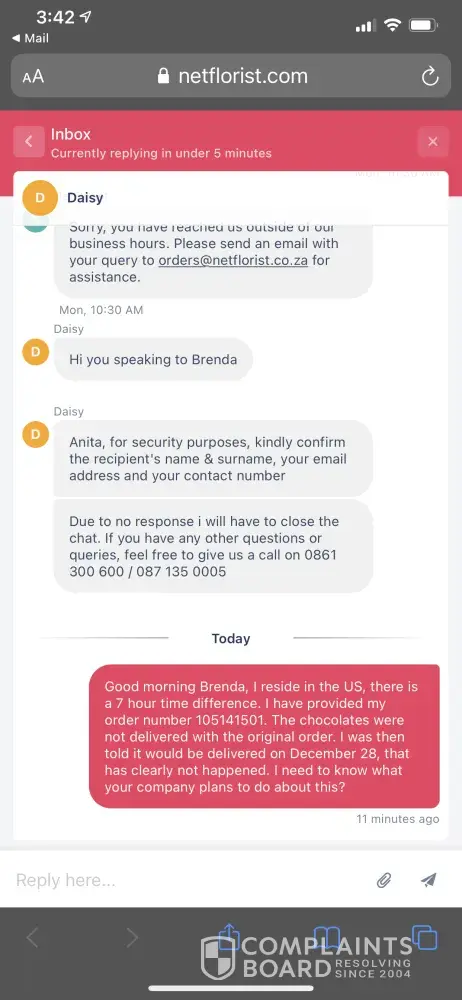 The response from Netflorist has been non-existent and, with continuous effort from my part, they have now further insulted me by offering a R150 credit on my account that I should use towards a future order with them. Why would I ever want to use them again if they do clearly not respect their customers or the recipients of the gifts.