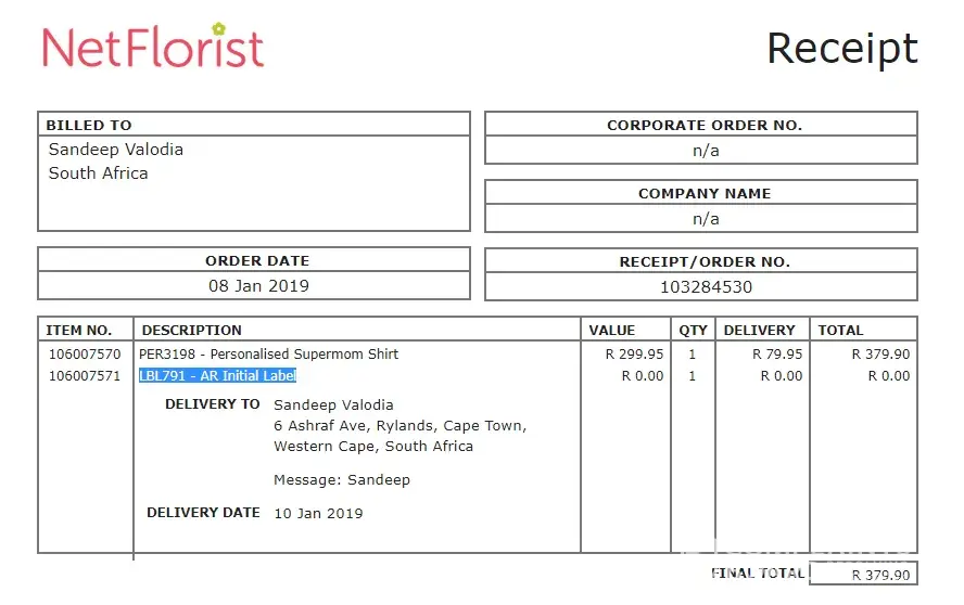 I am utterly disgusted with the service from Netflorist. An order was placed on Thursday 24th January and payment was made. Before close of business a return email received from netflorist stipulating all is in order. No further correspondence received. Delivery date ordered was today 28th January . After 2pm I received a call stipulating that my image cannot be opened, but the image was attached as I spoke to Tershan who helped me with the order. The occasion was for today and because of netflorist incompetence the delivery will not take place. That is pathetic service, could this not have been ascertained on Friday to ensure all would be in order for delivery date. The date stipulates on my request was 28th January and netflorist has broken the agreed date contract. What type of Nicky mouse company does that. I will log a complaint on hello peter and social media about the pathetic service received. This is the second time that netflorist has done this with my orders and the previous time netflorist did not have the decency to respond or apologize for their omission. You do not know the meaning of customer service. I demand an apology letter and some form of complimentary compensation for the inconvenience caused. This is disgusting service.