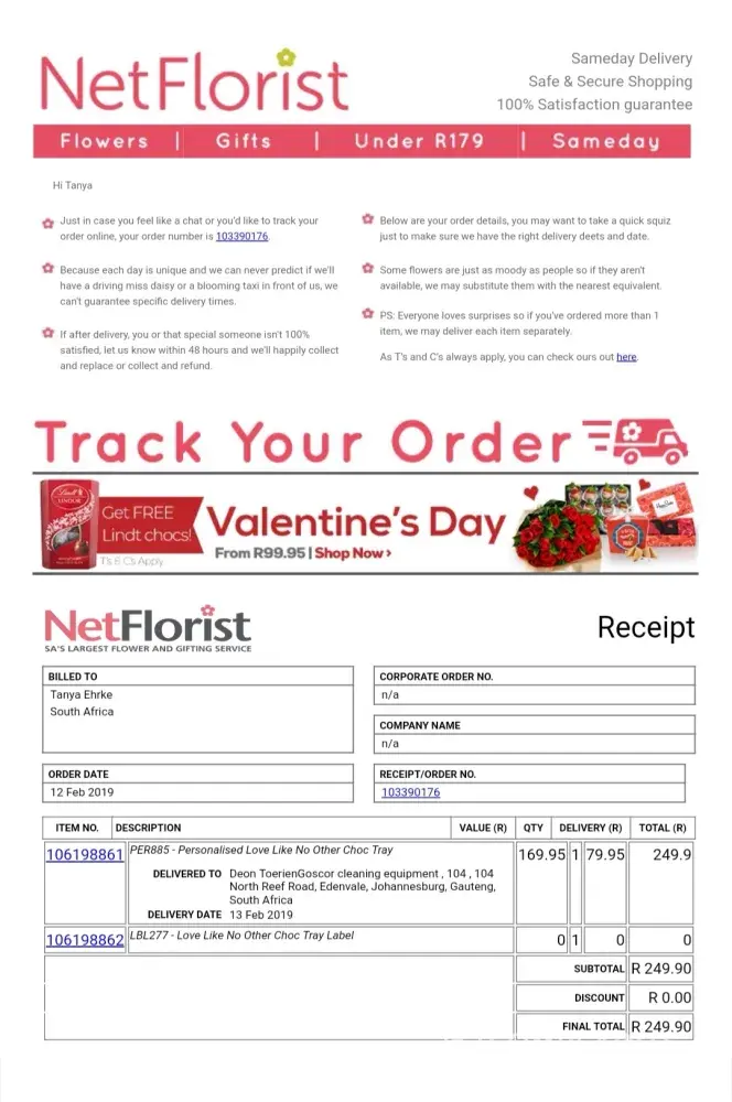 I am utterly disgusted with the service from Netflorist. An order was placed on Friday 1 February 2019 and payment was made. Before close of business a return email received from netflorist stipulating all is in order. Delivery date ordered was for 1 February. After 2 pm I received an email stating that the delivery would be done on that day. The occasion was for That day and because of netflorist incompetence, the delivery will not take place. That is pathetic service, could this not have been ascertained on Friday to ensure all would be in order for delivery date. The date stipulates on my request was 1st February and netflorist has broken the agreed date contract. Again on the 2nd February 2019, I was told that the flowers would be delivered as the person to received it cancelled her flight due to myself that told her that she will receive a package from Netflorist and she should expect it before 12 noon, but to her disappointment was never delivered. I will log a complaint on hello peter and social media about the pathetic service received. This is the second time that netflorist has done this with my orders and the previous time netflorist did not have the decency to respond or apologize for their omission. You do not know the meaning of customer service. I demand an apology letter and some form of complimentary compensation for the inconvenience caused. This is disgusting service.