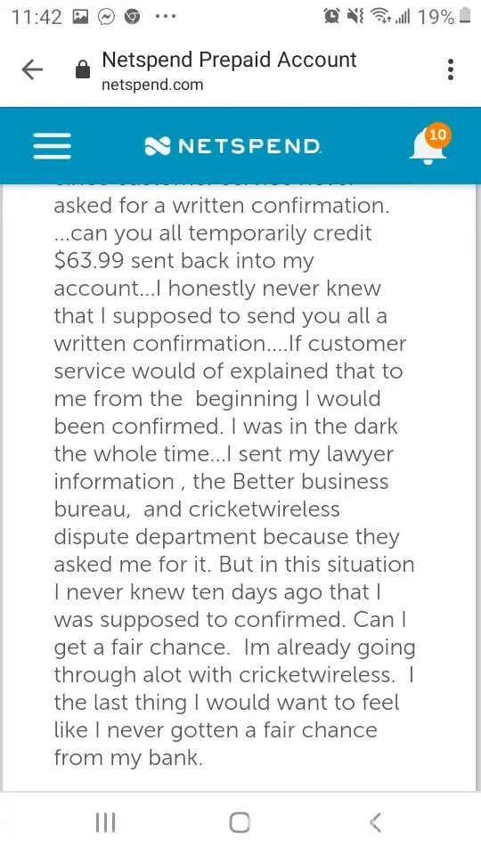 I initially file a dispute with netspend on March 19, 2020. It was several unauthorized transactions done by Cricketwireless and I wanted dispute by netspend. Netspend customer service or netspend dispute department never verbally or through email asked me for written confirmation or additional information toward my dispute. They never said Mrs Duggan you have 10 days to send us written confirmation or additional information so we can temporarily credit $63 back into my account they purposely kept that information and just gave me a bunch false hope telling me over the phone to be patient and we will credit the money by 04/02/2020. Its not cool to miscommunication with a customer, it's not cool to say they that going to do something and nothing do it and leave me in the dark on alot of thing. If they would of verbally told me on the phone or through email that they needed a written confirmation don't you think I would of gave it to them... they never told me that... out of consideration they could sent me the document through email they have my email address... today is my first time even hearing from the dispute department...