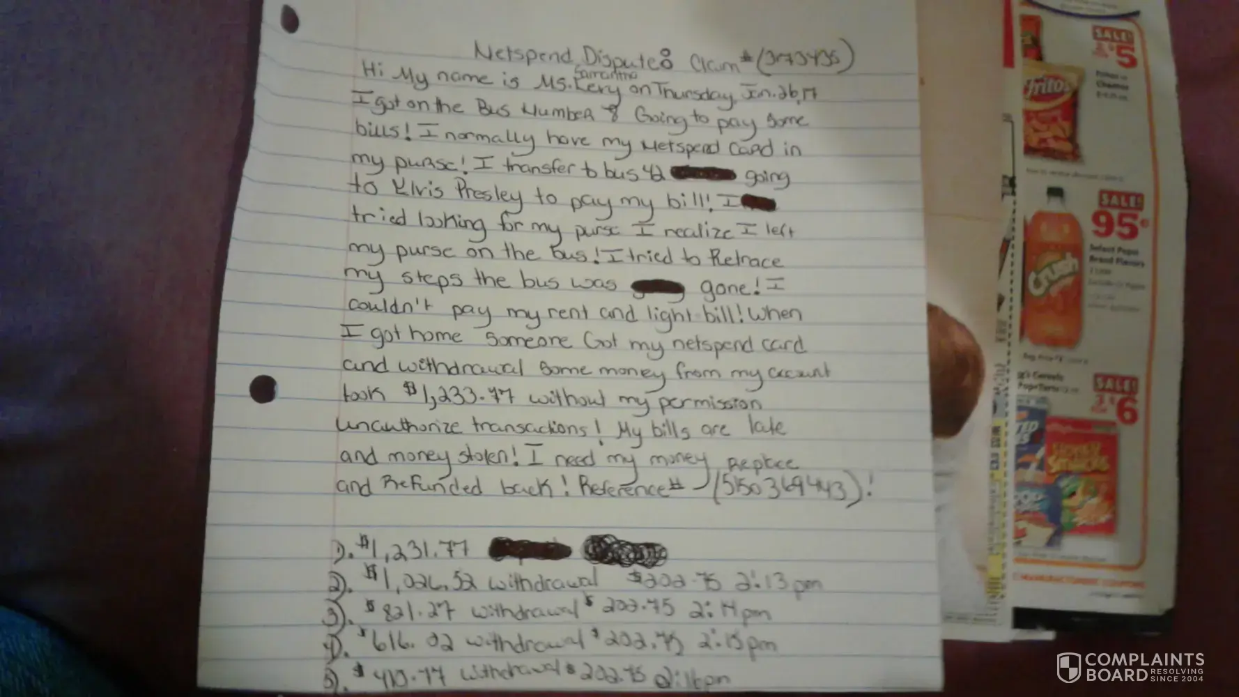 Claim #3173435 my name ms. levy thursday, january 26, 17 I got on the bus number 8 going to pay some bills! I normally have my netspend card in my purse! I transfer to bus 42 got off on elvis presley to metro pcs! when I got in the cellphone place I forgot my purse on the bus! I tried to retrace my steps the bus was gone! couldn't pay my rent and light bill! when I got home it was unauthorized transactions on my account! someone withdrawal money from my account without permission! I want refund back! reference #[protected]!