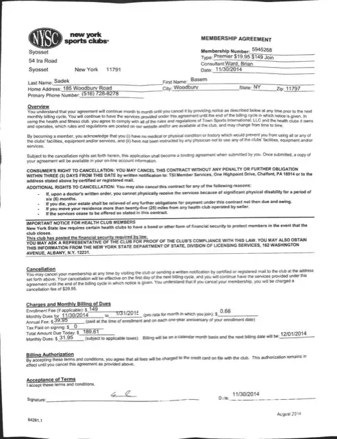 I never authorized or signed any membership agreement or authorized her to use a credit card that was issued in my name. If you look at her records, you can see that there has been NO USAGE on this membership because the membership was supposed to be canceled. Can you please look into this matter. This error was made by NYSC Great Neck and I should not be out $300 because they did not cancel the membership properly.