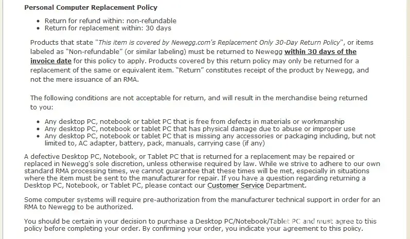 I spent close to two hours researching the item on newegg.com, including reviews, as well as their"computer replacement policies."the first thing I noticed was their"no refund"policy. While I thought this was an odd policy considering other online stores such as amazon allow for refunds (Minus a 15% restocking fee, but a refund none the least), I didn't let it sway my decision as I was dead-set on the model I wanted, and did not forsee any reason why I would want to return it for a refund. I then reviewed their"computer replacement policy"which is actually separated into two sections -"computer replacement return only"and"personal computer replacement". The policy was fairly typical of most online retailers, nothing out of the ordinary. So I went ahead with the purchase.