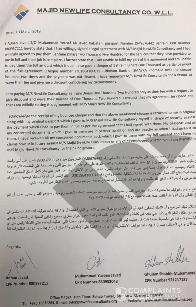 Adnan Javed worked at Crown Plaza hotel in Diplomatic area in Bahrain. He came to NewLife Consultants to hire their services and a service was provided to him successfully and his visa was issued due to the efforts of NewLife Consultants. However, Adnan Javed did not fulfill the legal agreement that he signed with NewLife Consultants and did not pay their service fees which is a breach of contract. He also provided a fraudulent cheque to NewLife Consultants which bounced. He was being reported to local police authorities but he begged and pleaded with NewLife Consultants management to forgive him. He then brought Yaseen Javed (His brother), Ghulam Shabbir (Their friend employed in local police) and a local person as his guarantors. All these people asked to forgive Adnan Javed and show mercy. They provided guarantee for Adnan Javed and requested to give him discount because he is from a poor family. Adnan Javed and his brother Yaseen apologized for their fraudulent attempt to cheat NewLife Consultants of their fees and Adnan Javed himself asked for forgiveness and requested to wave some fees and return his documents that he provided to NewLife Consultants as a guarantee. NewLife Consultants management considered their request, returned his documents and did not file any legal case against him or his brother Yaseen and their accomplices. Such is the character or this Adnan Javed that for all the good that is done to him, this is what he does. After getting favors and services from NewLife consultants he runs abroad and tries to defame and black mail NewLife Consultants company for financial benefits. He shows his true criminal nature and posts pathetic things on the internet, including fake information of some person with a wanted list name. NewLife Consultants is a responsible company and pictures of Adnan Javed are legally provided by Adnan Javed and his promotion on the NewLife Consultants facebook page is authorized by Adnan Javed in a separate legal document with his authority and undertaking that he signed himself. Some information and documents of Adnan Javed including his apology letter to NewLife Consultants signed by him, his brother Yaseen, their friend Ghulam Shabbir in presence of a local witness, and copy of their bounced fraudulent cheque; is attached here for reference and understanding along with their Bahrain CPRs (IDs). A legal case is being filed in the court and local police station against Adnan Javed, Yaseen Javed and Ghulam Shabbir, for defamation and criminal activities against NewLife Consultants and also cases are being registered against them in their current residing countries. NewLife Consultants is a responsible company and has open doors and channels for any genuine claims or grievance that any person might have. NewLife Consultants takes such allegations very seriously any such attempt to defame the company will be taken to the court of law and all legal forums.