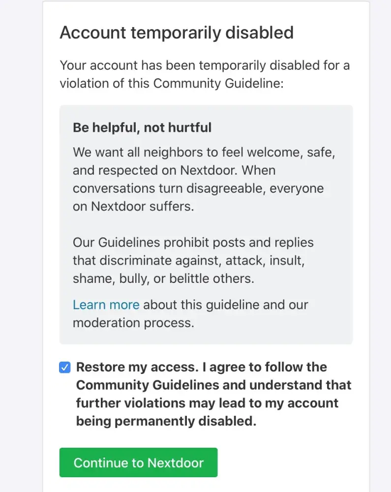 In December I was suspended until Jan 20, 2020. This is Jan 22, 2020 and still cannot log back in. This should be an automatic lifting of the suspension once the time has elapsed. The system take me back to the first screen as soon as I press the "Contnue to Nextdoor".