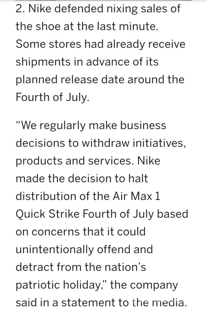 I, along with many, many others, are utterly at a loss for words for Nike's unacceptable, pathetic, anti-American & foolish decision to cancel the production and sale of this shoe. This is a complete joke that a company that has/had millions of customers would listen to one individual who ruined his own reputation by doing such an unamerican & unpatriotic move in such a public way that you "Nike" is standing beside such a piece of garbage and bowing down to "his beliefs". Well Nike, what about sticking to doing what you were initially planning on doing? You "Nike" followed the advice of a man whose business model is to stir grievance and controversy for its own sake. Suddenly, millions of people who once thought the Betsy Ross flag was just an admirable bit of Americana now associate it with hate groups. But guess what Nike? The Betsy Ross flag, "it doesn't appear on the Anti-Defamation League's list of 179 hate symbols. "It's not a hate symbol, " the Anti-Defamation League's director of investigative research Mark Pitcavage told the Washington Post.