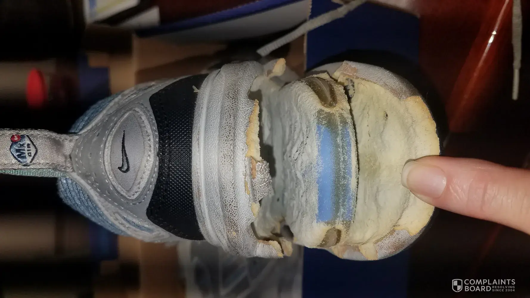 I have never seen this happen with any pair of tennis shoe I've ever owned. Yes, the shoes are fairly old but they are very lightly worn only worn on rare occasions and stored indoors. I decided to go back to the gym, pulled the shoes out wore them to the gym then next day wore them to walk my dogs... got about a mile in and one sole started flopping so much so I had to tear it completely off then limp all the way home on uneven shoes! When I got home I inspected the other shoe and found it was about to do the same thing. Very poor quality product. Highly disappointed.