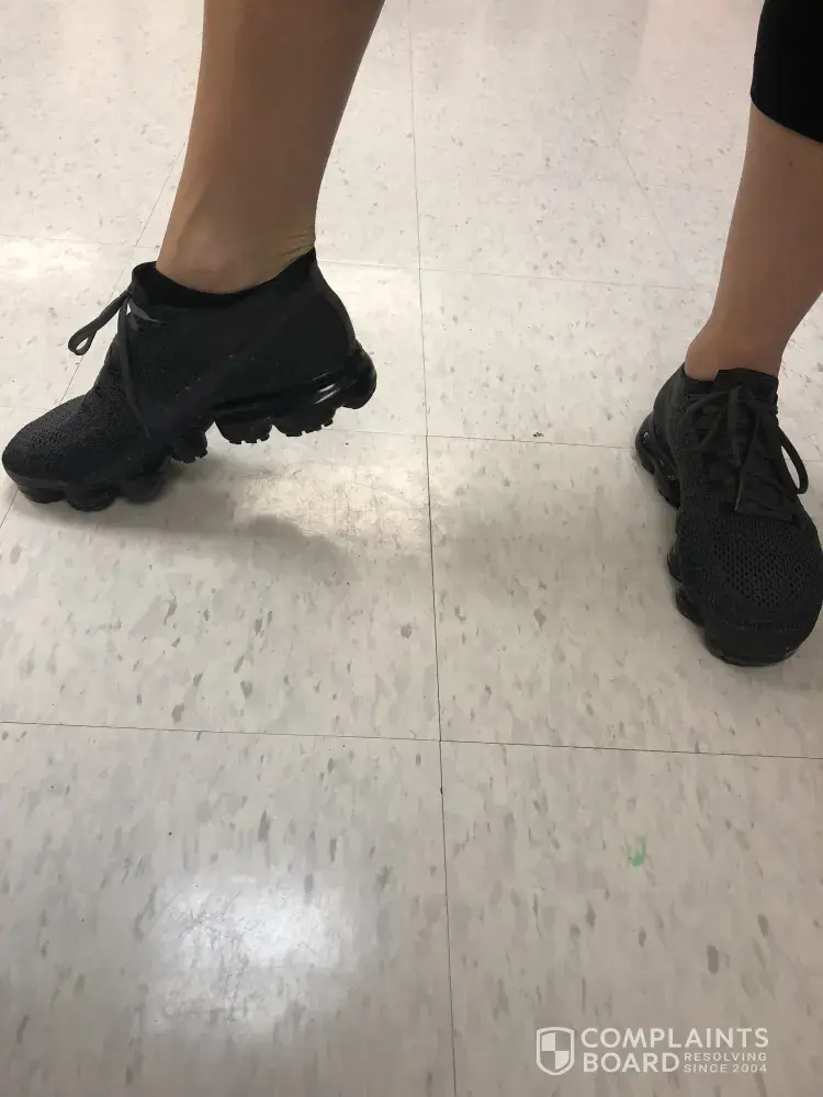 Hi, My husband bought me this pair Nike VaporMax for my birthday in October 2018. I still had a pair of Nike shoes that were in good shape for running so I kept these until those were a little more beat up. I wore them to the gym yesterday and the back bubble on my right heel must have a small hole in it. When I push down on my right heel I can hear air being released from the shoe and my heel touched the ground. I am unhappy because I haven't even gotten to experience the shoes because they cant be worn like this. I am an avid runner and there is no way that I can run in these shoes. I have attached images of the shoes, their condition and a visual that the heel is actually popped. I would like a refund or an equal amount to be able to buy another pair of shoes.