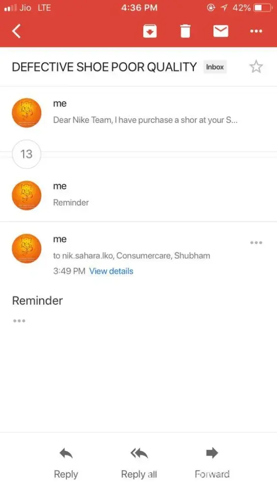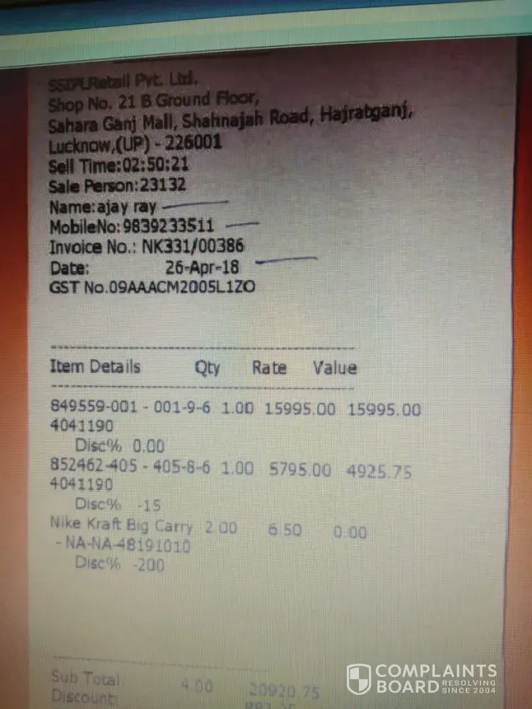 then after this complain i will case file at your brand NIKE because your product is duplicate in your Lucknow store and worst service, i was write on your customer care id 16th time but your team was not reply on the same issue, find the proof at below attachment ..