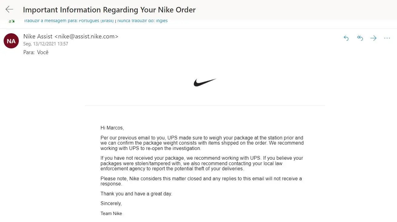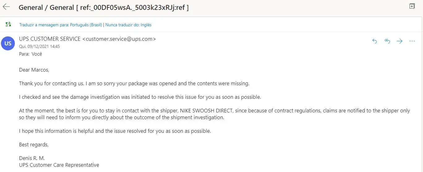 I've been trying to get an answer from Nike and UPS since them, and since then I did not receive any other official feedback from my claim until today's response from Nike saying that they will not replace or refund the item.