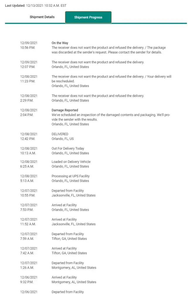 After one week waiting and tracking the order, the UPS delivery employee rang my door bell on December, 8th, 2021, 12:42pm, and I imediatelly picked up the UPS Box of his hands and electronically signed the delivery.
