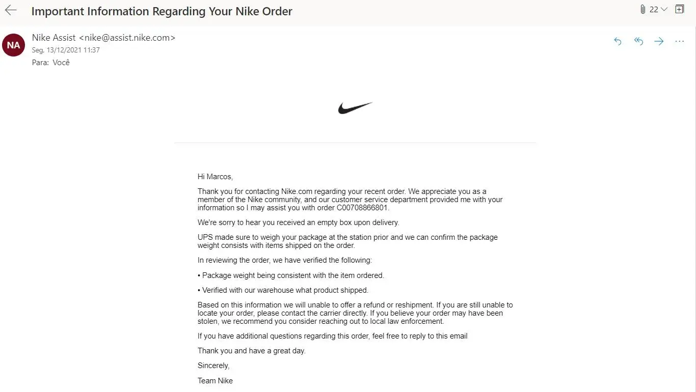 As soon as I noticed that the watch and accessories were missing, I imediatelly contacted Nike through the chat, after several unsuccessful attempts on the phone [protected]) to inform the occurred, filing a claim.