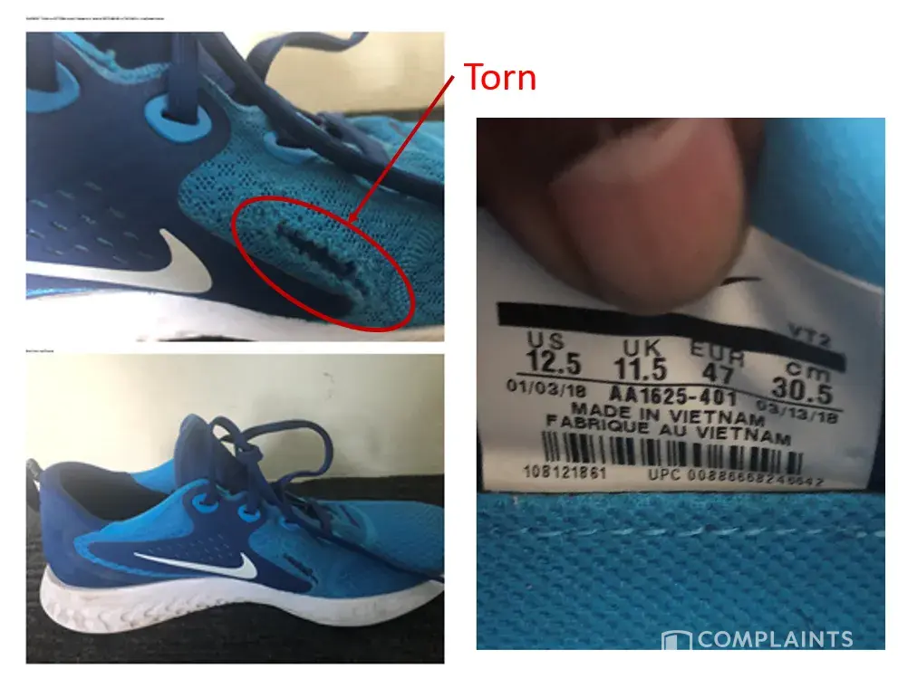 Hi, I have purchased Nike react shoes from Aurora Farms Premium Outlets on 04/07/2019, which is 4 months back and using this shoes only for running during weekends, but the shoe was torn within few months and i am not happy with the product . Please check and do the needful. Hope you reply to my email is "Sudheerkotagiri.[protected]@gmail.com". Attaching the shoe pics and bill for your reference.