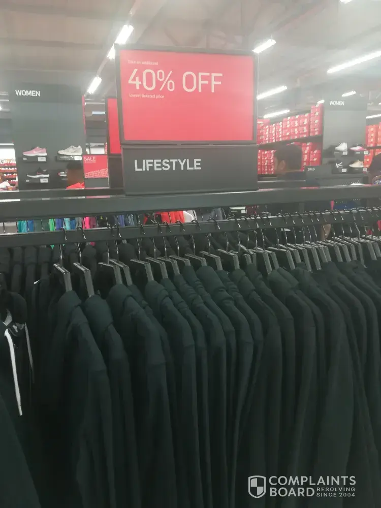 I went to the Nike factory store on Sunday the 29th September, they had on display that there merchandise on the rack was less 40%, I found a jacket that I liked and the sticker on the jacket was 30%, however the sign did not stipulate that the items on the rack were "from 40%" I have attached pictures as proof. I went to the counter to pay for my item and...