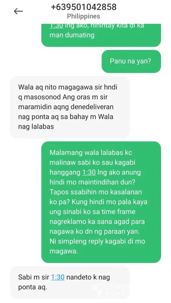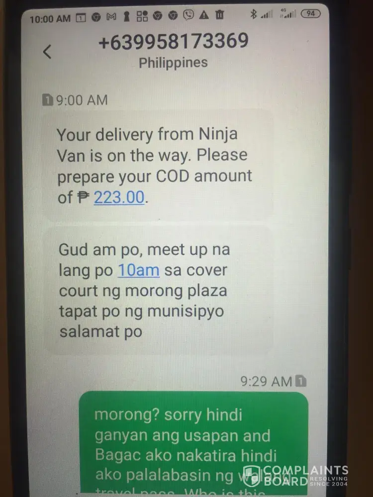I got a text message from ninja van this his phone number, 09958173369. He said that I will meet him in Morong Bataan. Poor customer service. Its a COD (cash on delivery) why am I going to meet him in Morong when my place is Bagac, Bataan.