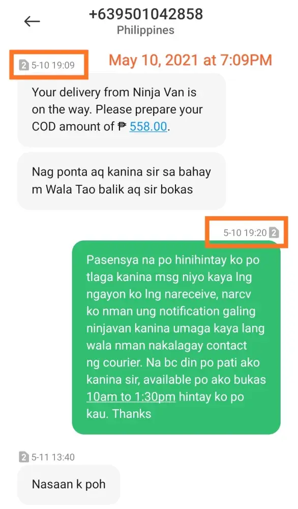I had an issue with NinjaVan's courier, his very rude and does not understand how to follow instructions. I was supposed to receive a package two days ago on May 10, 2021 but I failed to receive it because I had to go some place else and I wasn't able to inform him prior because I was waiting for him to send me some notification (because they should be) so I could then tell him about my situation and so I could maybe ask him to deliver it later on that day. I kept waiting all day but I received his message very late in the afternoon and he said that he will try to deliver the next day and so I agreed and I even apologized for what happened and told him that I will be available the next morning at 10am to 1:30pm only and I assumed he agreed because he did not reply. But then the next morning, I waited until 1:30pm but he did not arrive and so I had to leave because I have something else to do, and after I driven miles away from home the courier starts sending me notifications that he is waiting at my doorstep! What the hell? So I argued with him and told him I've been waiting for him but he did not come he did not even sent me a message at all if his going to be late or what and he replied telling me that he cannot follow the time frame I asked him so I was even more infuriated because if he cannot then why didn't he complain about it yesterday when I could still have a chance to atleast make some way to receive the f****** item I ordered. And he still followed that up with another message telling me that he DID arrive 1:30pm, now should I be happy with it you think? What an a**. Is that the kind of training NinjaVan gives to their couriers? Very very disappointing! I was trying to communicate with the courier so we could reach something favorable for both of us but he DID NOT try to communicate back. The courier doesn't care, now he's sending back my item to the seller. I am so annoyed by his rudeness and lack of professionalism.
