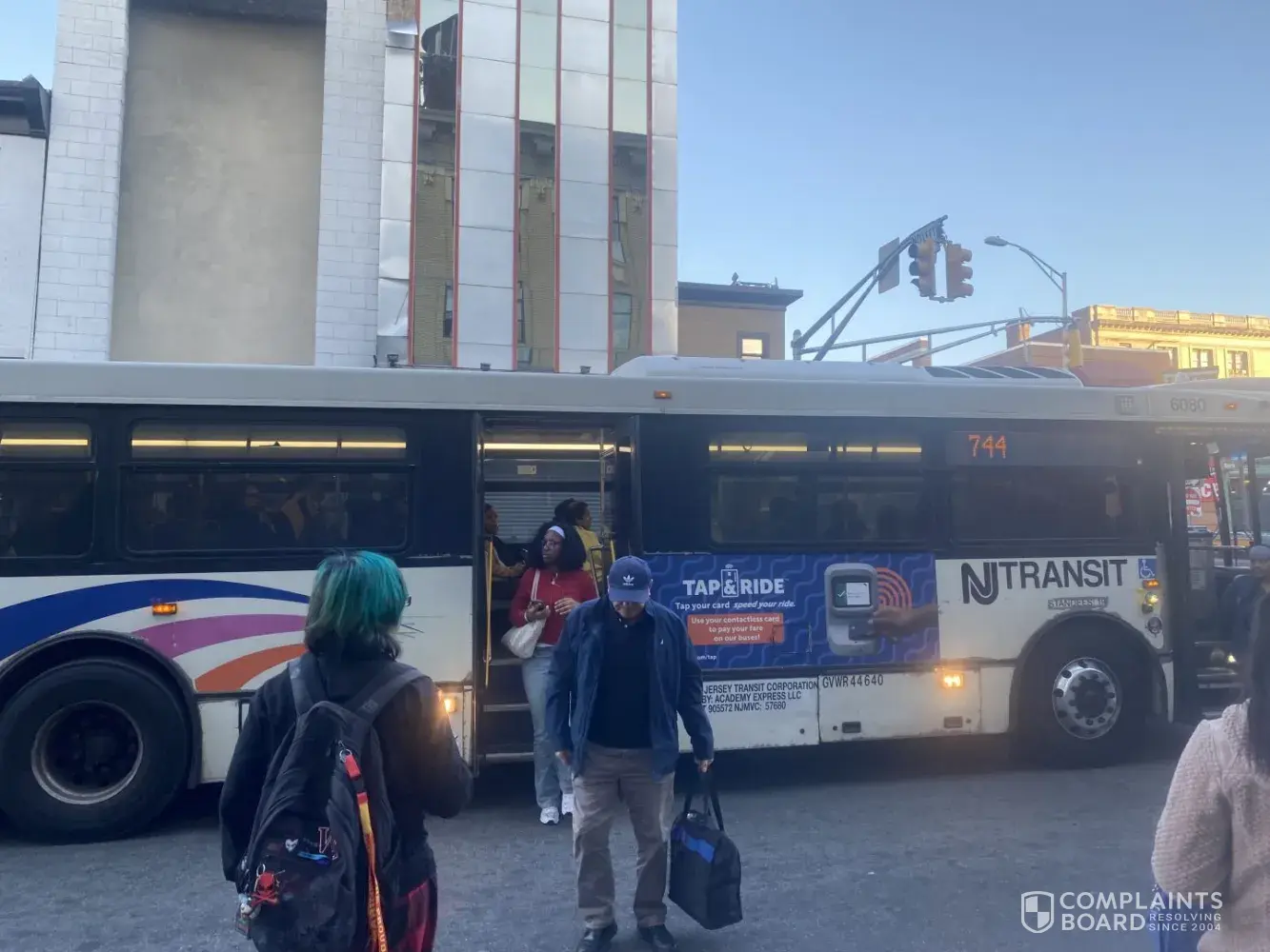 Bus #744 scheduled at 4:54 pm at William Paterson Stop, headed to Paterson. Bus #6080 OVERLOADED the bus so that two students were made to ride inside the back doorway. I had to REPEATEDLY get off the bus BACKWARDS to let ppl off while à student squeezed in next to me on the stairs. When someone got off and I almost passed out, à girl pushed passed me...
