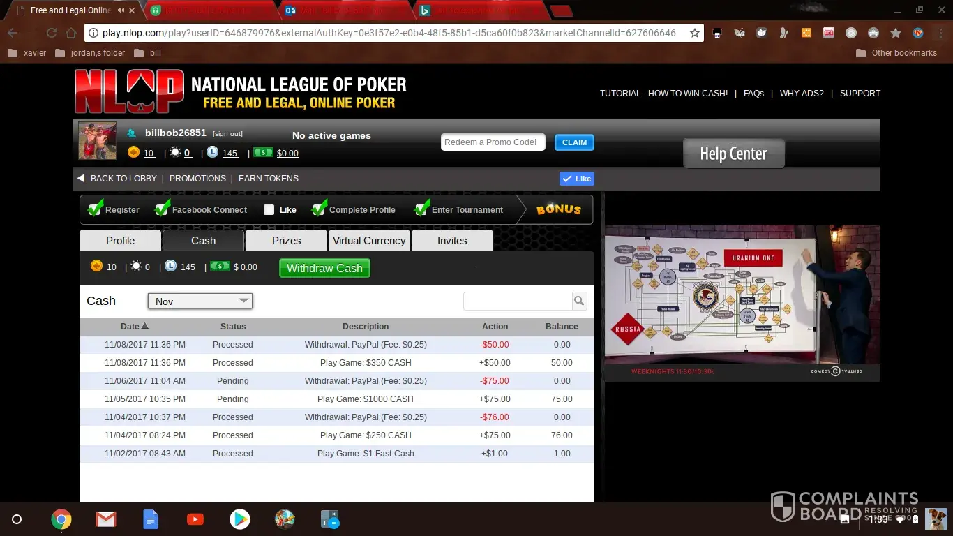 Nlop is a joke...I get kicked off every single time I am winning and anytime I'm about to win a decent amount the player will he down to their last chips and magically they have a run of luck beating me until I'm out of chips and we are talking bunk wins like ill have a 3 of kings they magically get dealt 2 aces on the last 2 with their one pocket ace for the win or the stupid watch add will pop up ill watch it go back to playing have a good winning hand and it'll hoot me off saying to watch the add I just freakin watched. Theres no respect or understanding from customer service or it magically shows no record of me even playing. When I sign up for freerolls ill check in and then it boots me off entirely and I cant get back onto my table. Dont play on this site its a scam and if u have won its only to keep u spending until u lose so much they have to toss u some sort of win. Worst site ive ever played on by far!