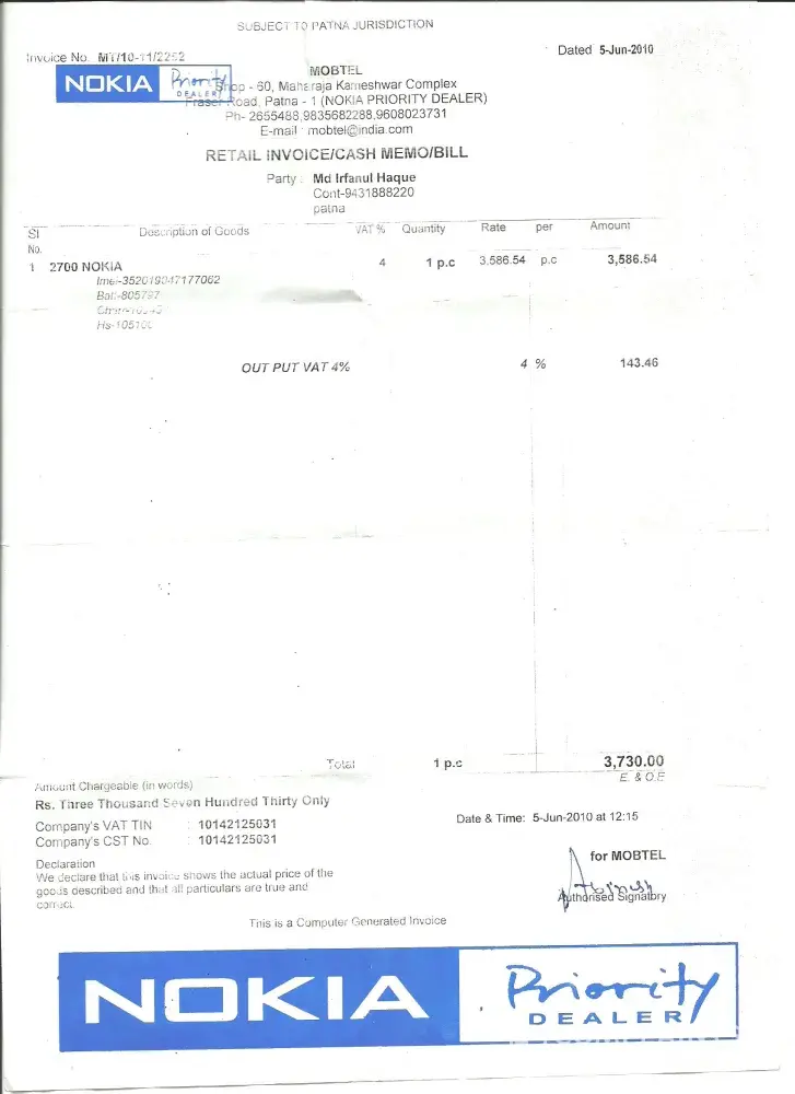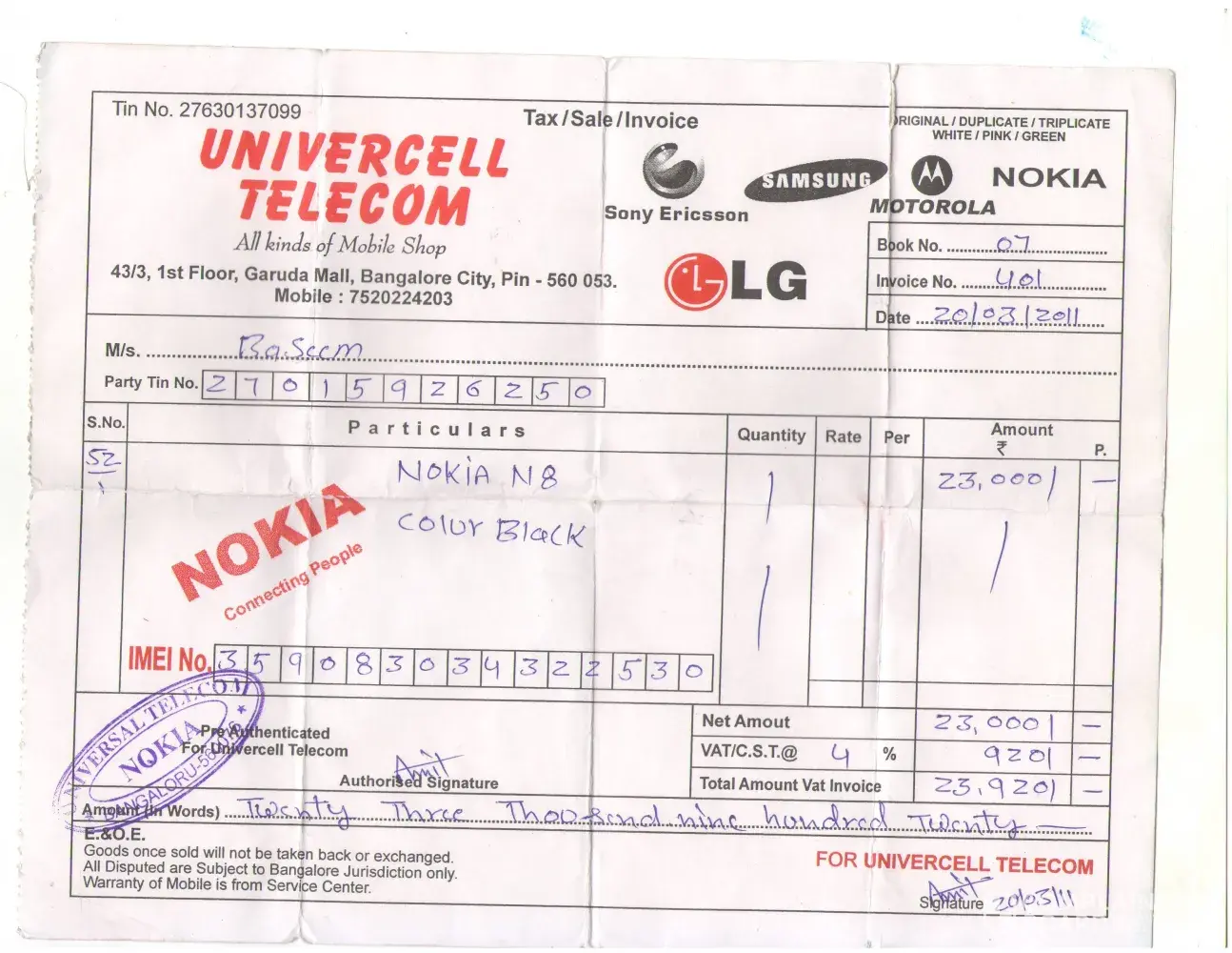 I purchase a nokia N – 8 colour black mobile phone but it’s not the original nokia mobile its a fake china made mobile I am providing my bill details so that it may help you all the related details are given below.
