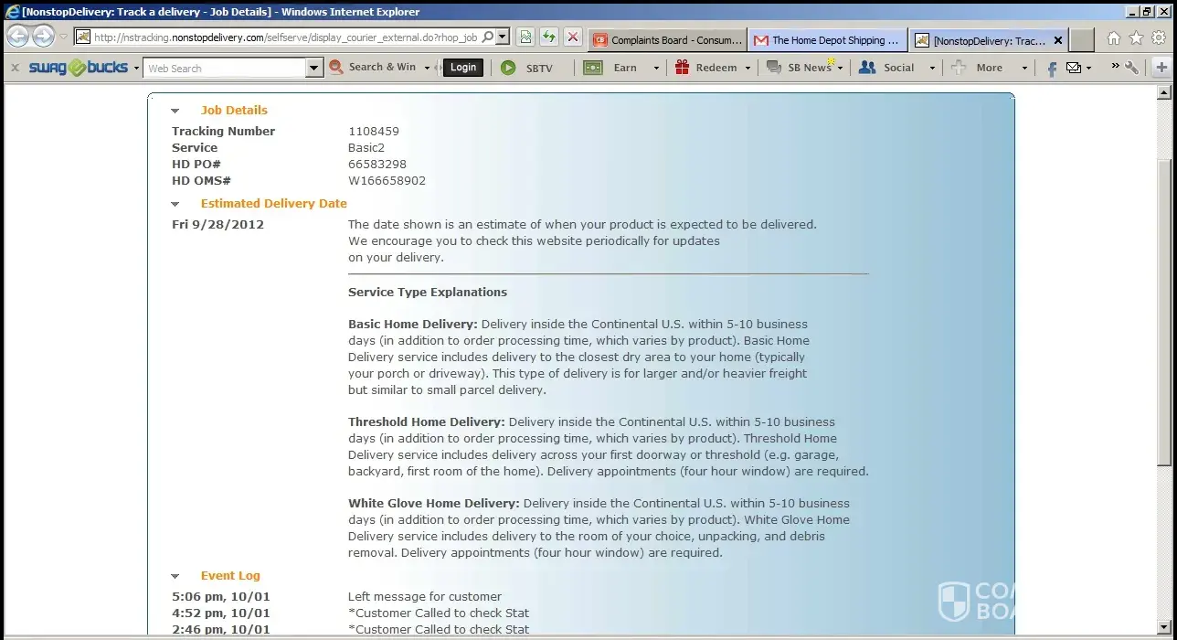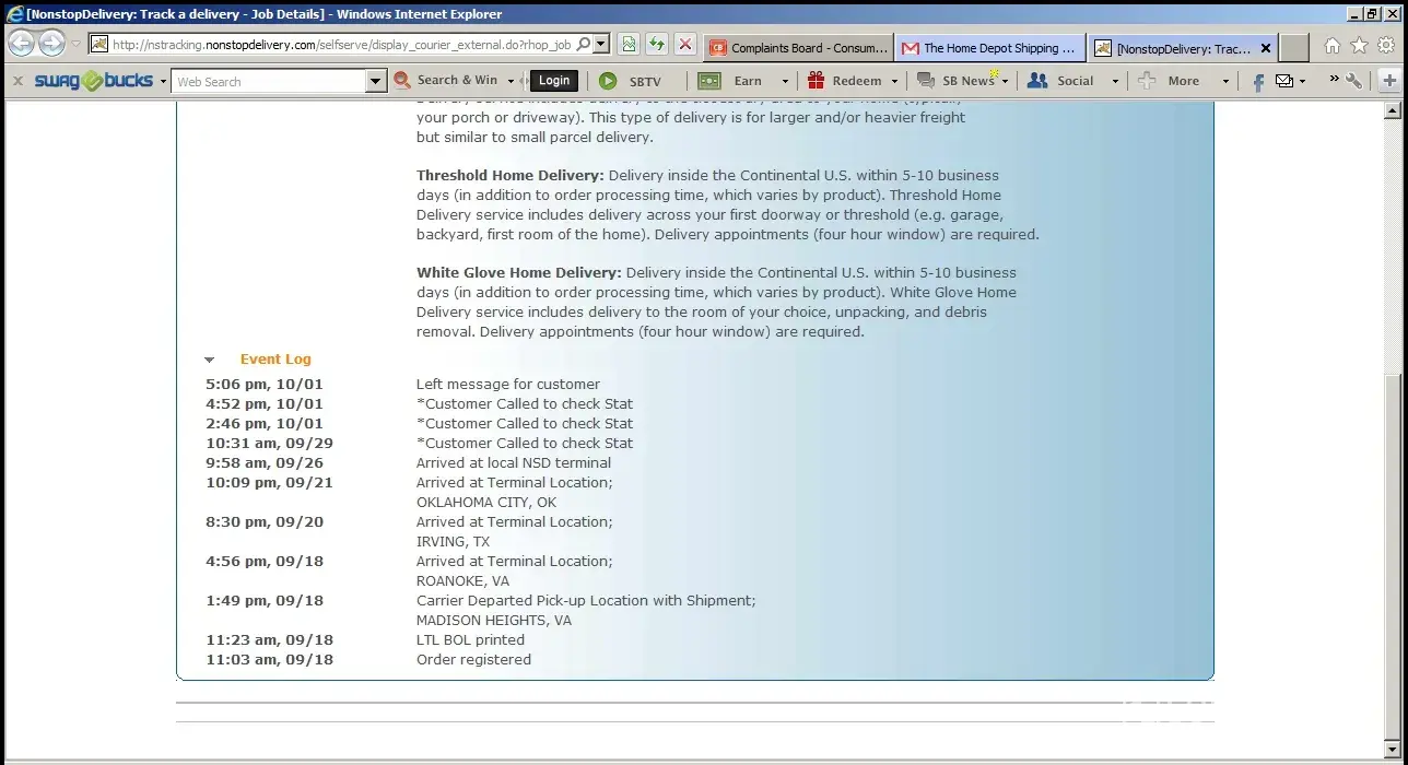 Ordered Wood Furnace est delivery was 9/28/12 It is 10/02/12 and the local NSD can't tell me where my shipment is or when it will be delivered. I don't think they could have lost it since it is 530lbs and around 3 ft tall! We paid almost $1300.00 I want to know where my product is, actually I would like my product delivered without any more excuses! On the log it says left message for customer which is a lie, no phone calls or emails from Non Stop Delivery, how about instead you type in on truck for delivery! I know this is NSD that can not seem to do what they need to do but I bought my product from Home Depot & they are the ones that decided to contract with this pitiful company, next time I order a large product I will choose site to store so if my product isn't there I can look the local HD manager in the eye while I listen to excuses!