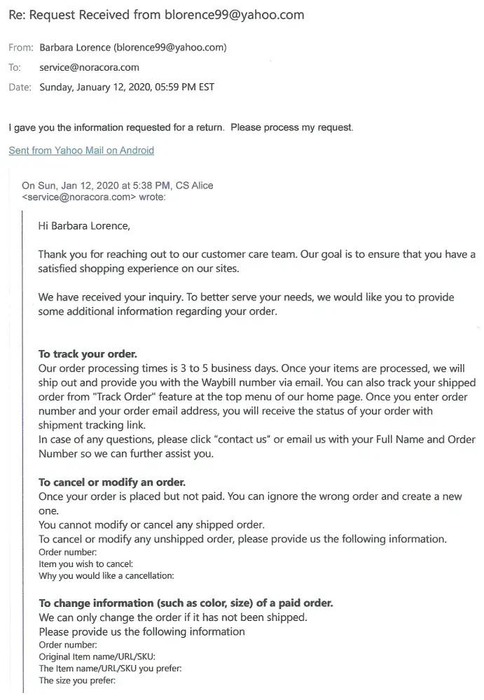 I have been trying to process my return via the Noracora website, as the website directs. I have provided them with the order number, delivery date, item number, amount paid, and reason for return. I continue to recieve the same email in return from NoraCora. It tell me that I need to provide the information which I just sent. So frustrating! They have a 15 day return window which now is almost over. I believe this company is a scam!