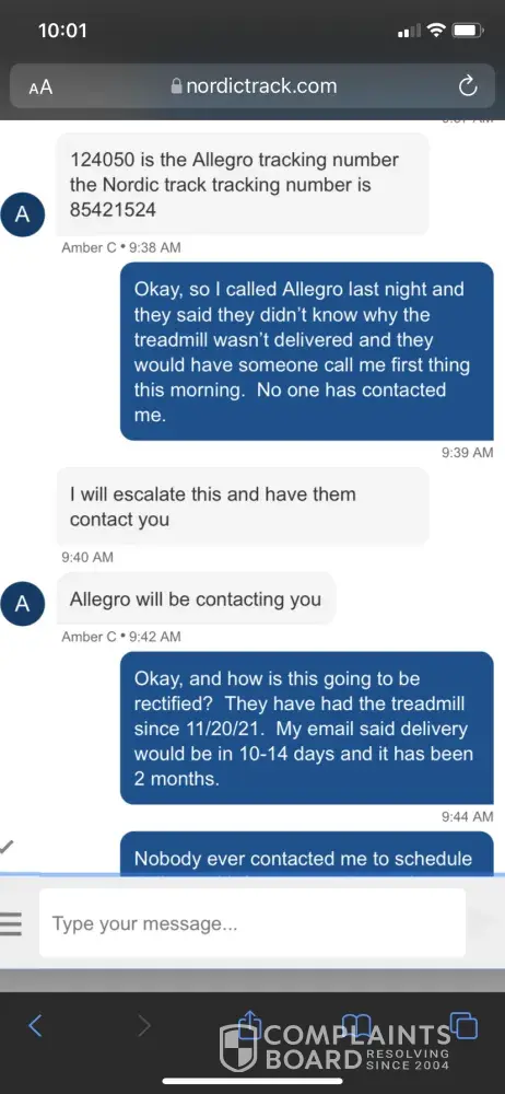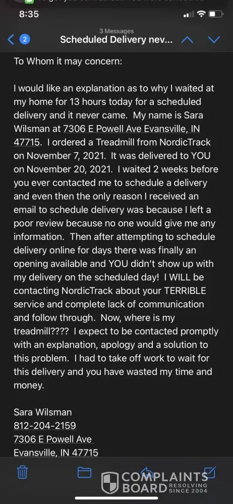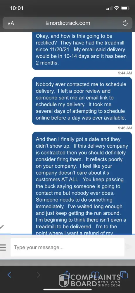 I ordered a treadmill directly through NordicTrack.com on 11/7/2021. The item was shipped to the local delivery company and arrived on 11/20/2021. I was told within a few days someone would call me to schedule delivery. After two weeks I contacted NordicTrack and they again just said someone will contact you in a few days. Another week went by and no one contacted me. Then NordicTrack asked me to review my treadmill so I gave it a poor review. Within a few hours of that I received an email link to schedule my delivery. I attempted multiple times to schedule online but it continuously gave me an error message ever time I selected a date. I finally was able to successfully schedule delivery for January 4, 2022. The night before the scheduled delivery I received an email that said my treadmill was scheduled to be delivered between midnight 1/4 through midnight 1/5. I waited all day. I had to take off work so I could be home for this threshold delivery. I even called the delivery company to confirm delivery was scheduled and what time frame. He said it should be scheduled between 8:00 am and 7:00 pm. I never received it. Over the next several days I have attempted to contact both the delivery company and NordicTrack via online chat, telephone, and email to get answers and reschedule delivery and they keep giving me the run around. No one will answer my questions. No one will reschedule me when I call. They just keep telling me they have expedited my complaint and someone else will call to reschedule "shortly". It has been two days without anyone calling me back.