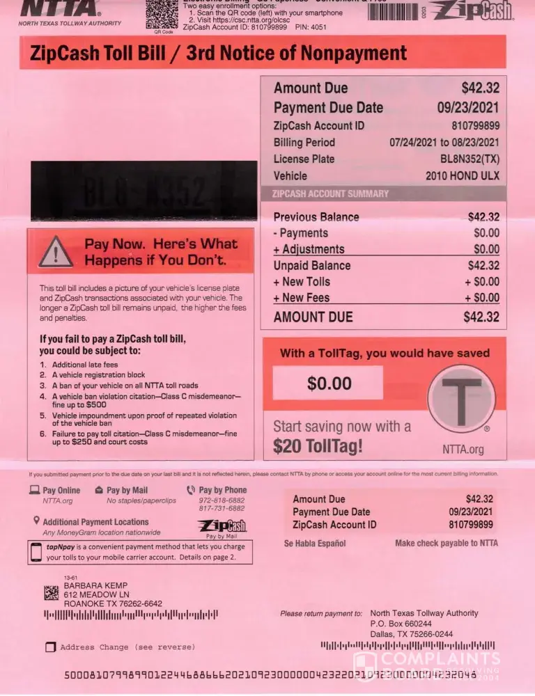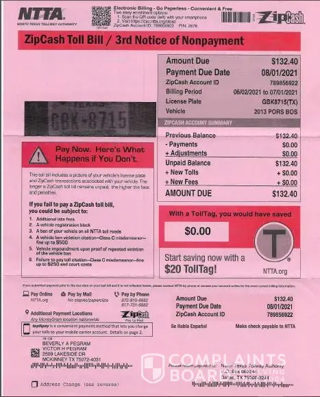 I need the NTTA to cancel this bill immediately. Zip cash account ID: [protected]
