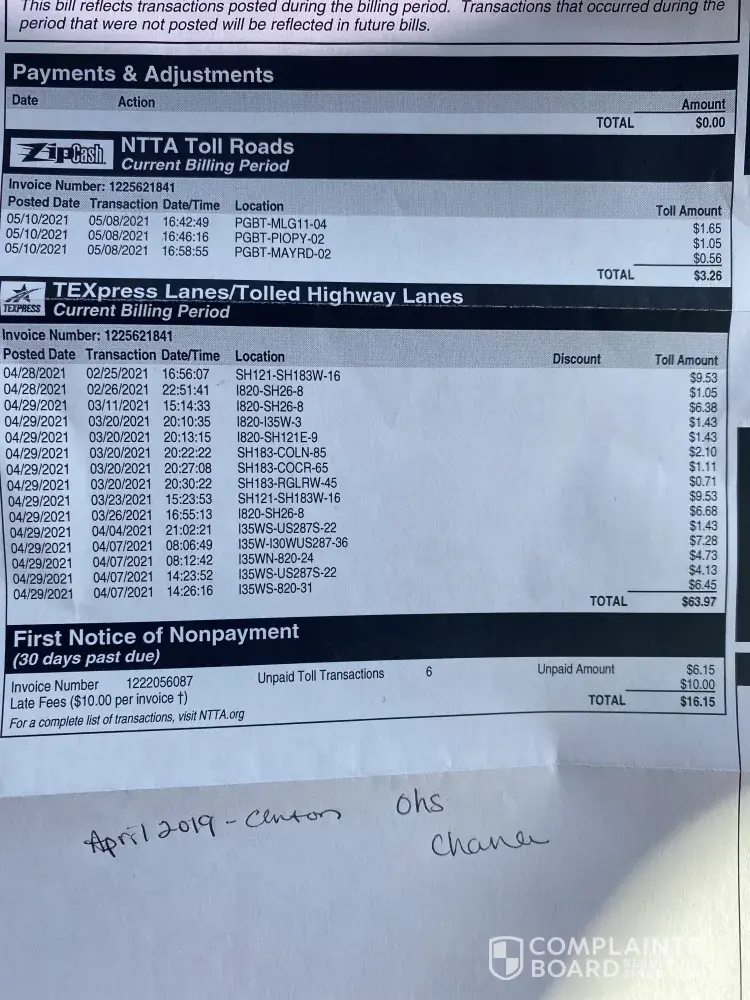 I would like to first say thank you for taking this complaint in! It's been so Frustrating when I think that I've completed all my bills with the toll tag and then something new comes into the mail saying that it is either my first notice of non-payment or my third notice as non-payment. I don't ever get a notice of PAYMENT ever. I received a first notice of non-payment of $83 from a charge from February 2021 I just made a payment in July 2021 of the same amount when I spoke to the person on the phone about my bill she noticed that I was up-to-date and I paid all my tolls. I finally go through the toll sometime this month in August and I just got a first notice of non-payment from zipcash that TEXpress is charging me from February 2021 to May 2021.